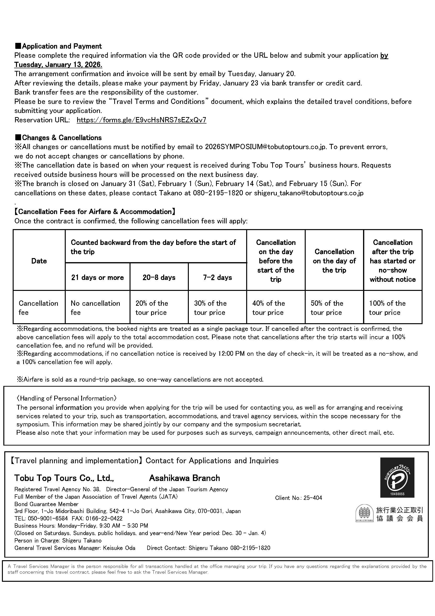 Please apply to the following website of TOBU TOP TOURS for the application of Symposium participation, hotel and air ticket reservations.