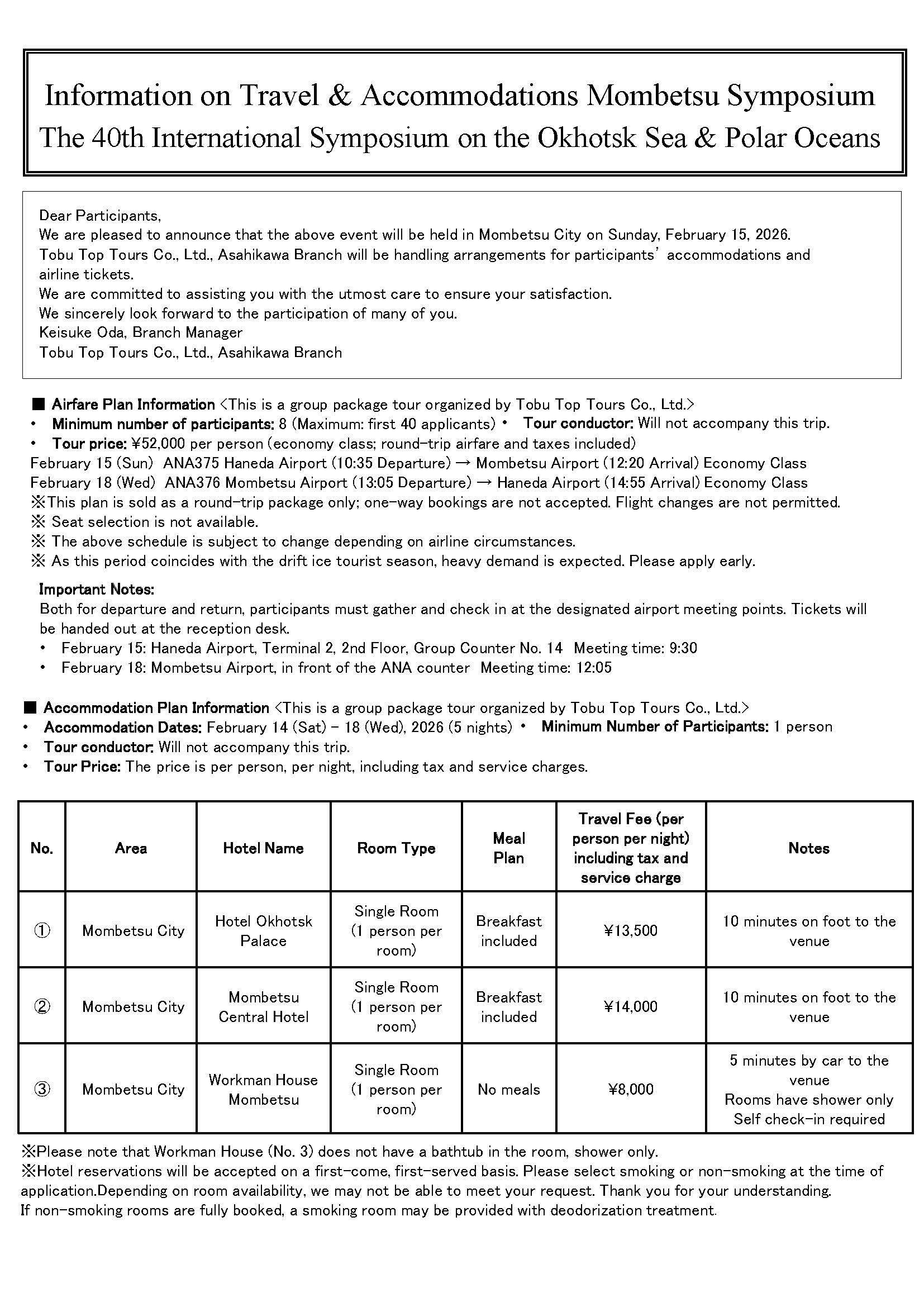 Notice: All fares are at the discounted prices and only available for symposium participants when the reservations are made through the TOBU TOP TOURS Co., Ltd. (Travel agent)